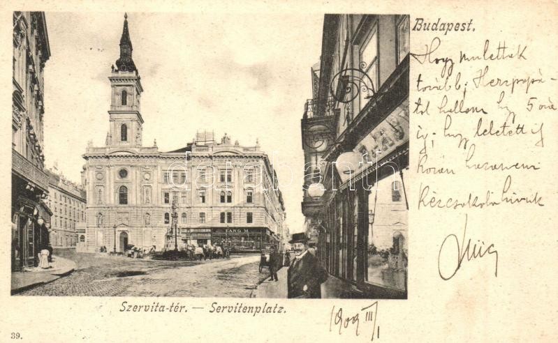 Leírás: Budapest V. Szervita tér, templom, Zelenkai, Lang M. üzletei (r)