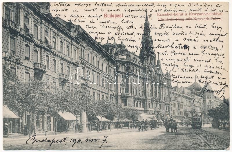 Budapest VII. Erzsébet körút a New York palotával, villamos https://www.darabanth.com/hu/308-Gyorsarveres/308.0/Kepeslapok/Magyarorszag~400007/Budapest-VII-Erzsebet-korut-a-New-York-palotaval-villamos~II1644954