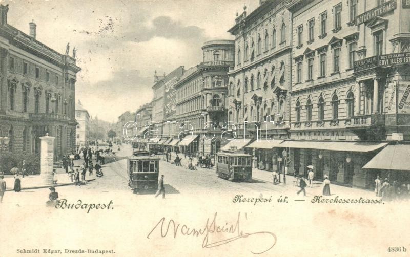 Budapest VII. Kerepesi út, Rákóczi út, villamosok, Emke kávéház, Hotel Orient szálloda, Szabadalmi mérnöki iroda, Réthy János utóda Edvi Illés István üzlete, valutaváltó, Párisi nagyáruház. Schmidt Edgar kiadása (b)