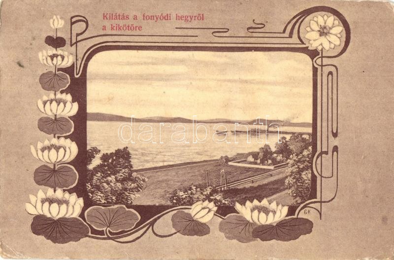Leírás: Fonyód, Kilátás a hegyről a kikötőre. Art Nouveau. Kapható Szövetkezet utóda Tóth József (EK)