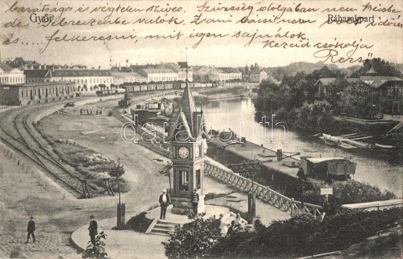 Győr, Rába rakpart, toronyóra, uszályok https://www.darabanth.com/hu/308-Gyorsarveres/308.0/Kepeslapok/Magyarorszag~400007/Gyor-Raba-rakpart-toronyora-uszalyok~II1644166