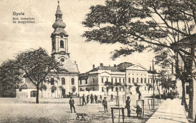 Gyula, Református templom és a Megyeháza. Leopold nyomda kiadása (EK) https://www.darabanth.com/hu/308-Gyorsarveres/308.0/Kepeslapok/Magyarorszag~400007/Gyula-Reformatus-templom-es-a-Megyehaza-Leopold-nyomda-kiadasa-EK~II1675278