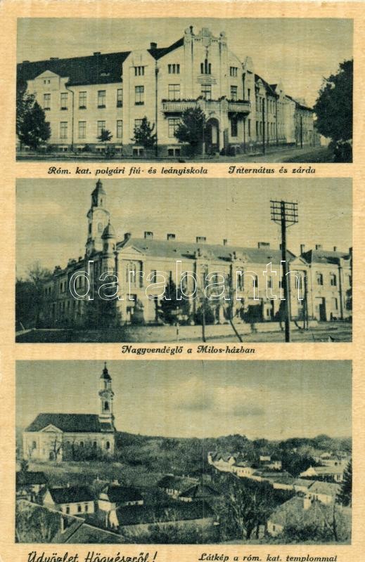 Leírás: Hőgyész, Római katolikus polgári fiú- és leányiskola, internátus és zárda, Nagyvendéglő a Milos-házban, étterem, Római katolikus templom