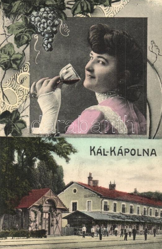 Leírás: Kál-Kápolna, vasútállomás, bort ivó hölgy, szőlős Art Nouveau keret (EK)