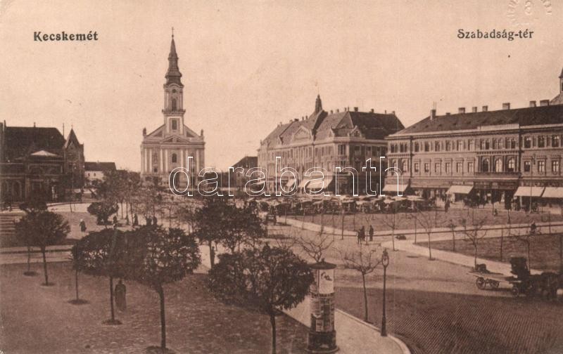 Leírás: Kecskemét, Szabadság tér, üzletek, piac, templom (EK)