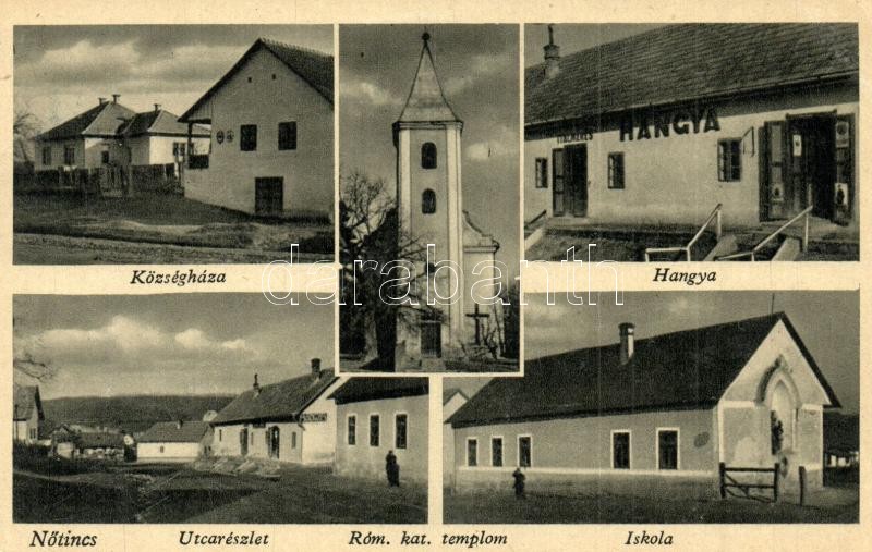 Leírás: Nőtincs, mozaiklap: Községháza, Római katolikus templom, utcakép, iskola, Hangya fogyasztási szövetkezet üzlete és saját kiadása (EK)