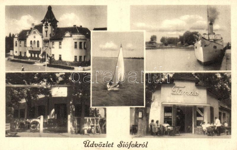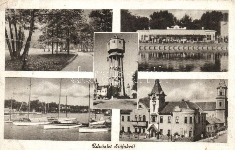 Leírás: Siófok 2db mozaikképes képeslap, rajtuk többek között a kikötő, víztorony, Községháza, Tünde presszó (egyik Rb)