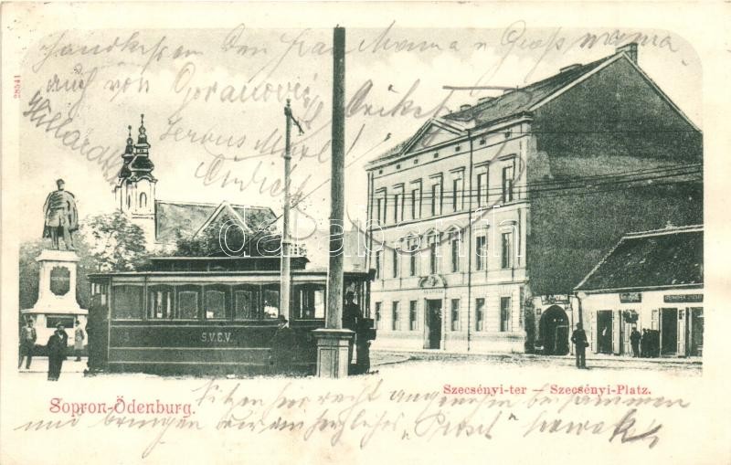 Leírás: Sopron, Széchenyi tér, Steinhöfer József üzlete, villamos (r)