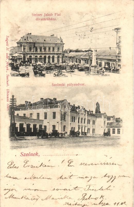 Leírás: Szolnok, Vasútállomás, Piac, árusok, Steiner Jakab Fiai üzlete. Szigeti H. kiadása
