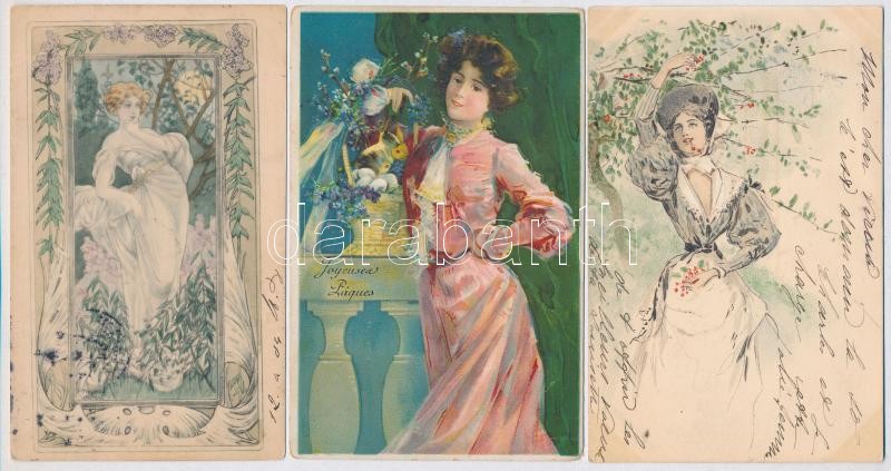 Leírás: 3 db régi művészlap hölgyekkel, közte 1 litho / 3 pre-1945 Art Nouveau art postcards with ladies, among them 1 litho