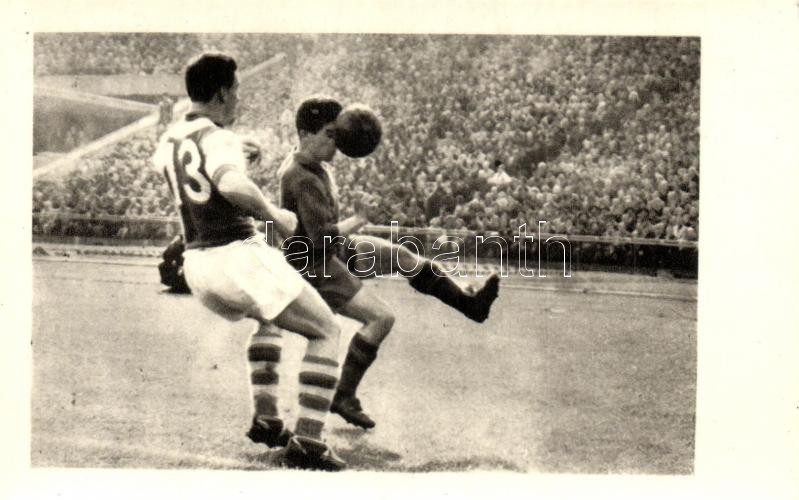 Leírás: Labdarúgás. A védő szoros emberfogását a csatár egyéni játékkal egyensúlyozza. Képzőművészeti Alap kiadása / football