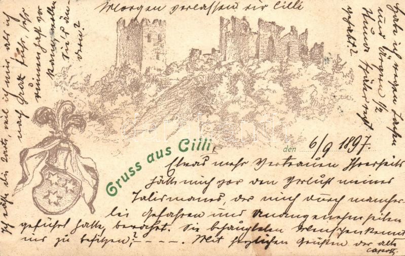 1897 (Vorläufer!) Celje, Cilli; Ruine Ober-Cilli / Celjski grad / Celj... https://www.darabanth.com/hu/308-Gyorsarveres/308.0/Kepeslapok/Szlovenia~400049/1897-Vorlaufer-Celje-Cilli-Ruine-Ober-Cilli-Celjski-grad-Celje-Upper-Castle-ruins-coat-of~II1672377