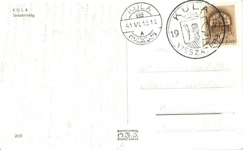 Leírás: Kúla, Wolfsburg, Kula; Járásbíróság / court, automobile "1941 Kula visszatért" So. Stpl (fa)