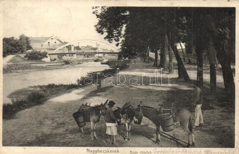 Leírás: Nagybecskerek, Velky Beckerek, Zrenjanin; Béga részlet, híd, vízvezeték, vízhordás szamarakkal. Knackstedt & Co. kiadása / Bega river bridge, canal, water carrying with donkeys (EK)