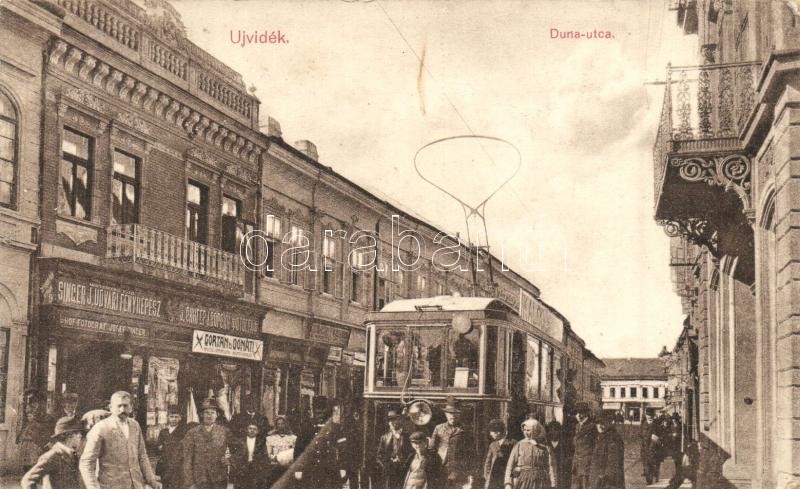 Leírás: Újvidék, Novi Sad; Duna utca, Singer fényképész, Gortan és Donáti üzletei, villamos. Singer kiadása / street view, photographer's atelier, shops, tram (EK)