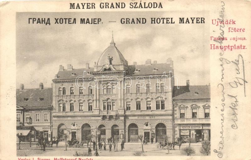 Újvidék, Novi Sad; Fő tér, Mayer Imre Grand szálloda, sörcsarnok, Herger Ágoston üzlete. Singer kiadása / main square, hotel, beer hall, shops (kis szakadás / small tear)