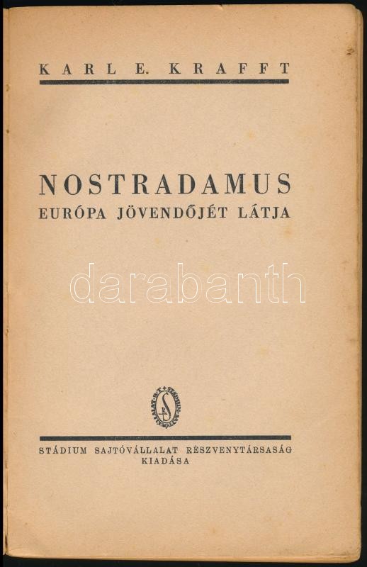 Krafft, Karl E.: Nostradamus Európa jövendőjét látja. Bp., Stádium. Ki... https://www.darabanth.com/hu/308-Gyorsarveres/308.0/Konyvek/Konyvek-Egyeb-ritkasagok~500018/Krafft-Karl-E-Nostradamus-Europa-jovendojet-latja-Bp-Stadium-Kiadoi-papirkotes-Ger~II1669971