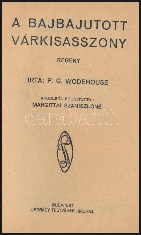 P. G. Wodehouse: A bajbajutott várkisasszony. Fordította: Margittai Szaniszlóné. A borító Kürthy György munkája. Pesti Hírlap Könyve 77. Bp.,1929, Légrády. Kiadói papírkötés, kissé sérült gerinccel.
