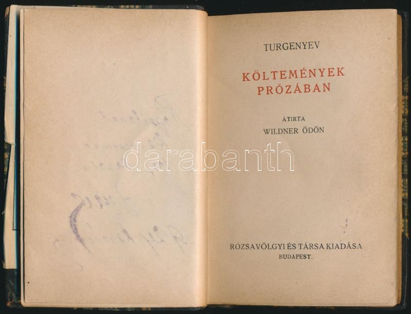 Turgenyev: Költemények prózában. Átírta Wildner Ödön. Bp., 1921, Rózsa... https://www.darabanth.com/hu/308-Gyorsarveres/308.0/Konyvek/Konyvek-Egyeb-ritkasagok~500018/Turgenyev-Koltemenyek-prozaban-Atirta-Wildner-Odon-Bp-1921-Rozsavolgyi-es-Tarsa-K~II1541977