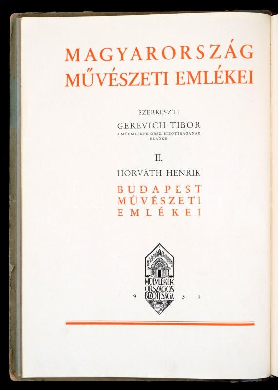 Horváth Henrik: Budapest művészeti emlékei. ElÅ‘szót Ãrta Gerevich Tibor. Magyarország művészeti emlékei II. kötet. Szerk.: Gerevich Tibor. Bp., 1938, Kir. Magy. Egyetemi Nyomda. Kiadói félbÅ‘r-kötés, kopottas, foltos borÃtóval.
