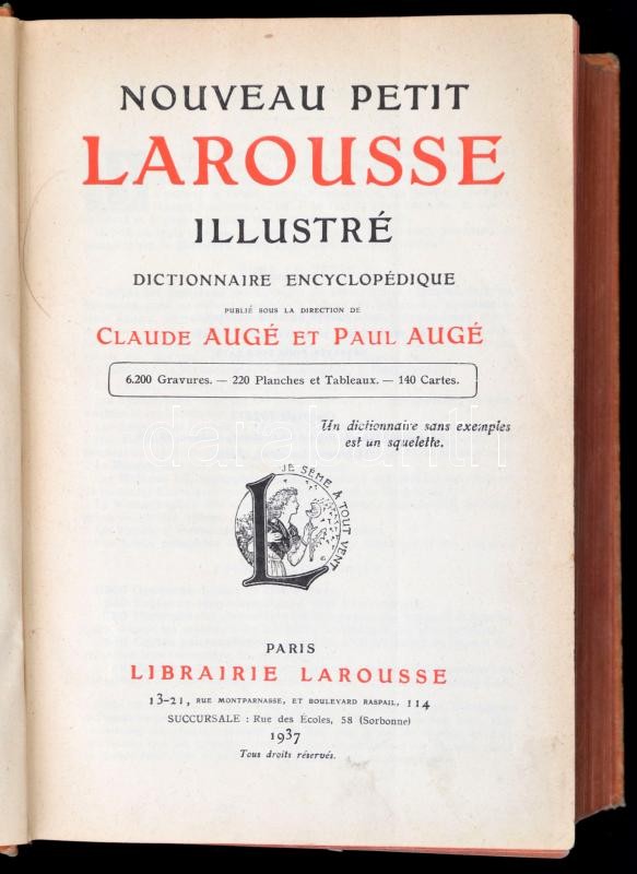 Nouveau petit Larousse illustré. Szerk.: Augé, Claude, Augé, Paul. Párizs, 1931. Libraire Larousse. Kicsit Díszes, aranyozott vászonkötésben jó állapotban / In full linen binding