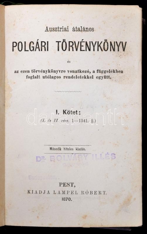 Függelék az általános polgári törvénykönyvhöz Magyar-, Horvát-, Tótország, a Szerbvajdaság és a temesi bánság számára. Második hiteles kiadás. Pest, 1870. Lampel. 373 l.; 45 l. 194 l. 94 l. Korabeli sérült, dombornyomott egészvászon kötésben.