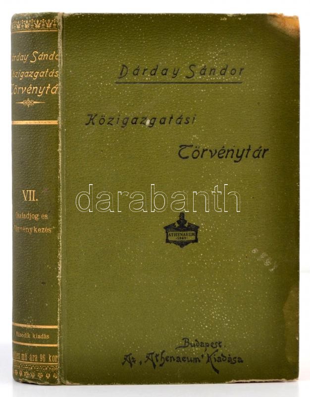 Dárday Sándor: Közigazgatási törvénytár. A fennálló törvények, rendeletek és döntvényekből rendszeresen összeállította: Dárday Sándor. Hetedik rész. Bp.,1897, Athenaeum. Második kiadás. Kiadói aranyozott gerincű egészvászon kötés, foltos, kissé sérült borítóval, de egyébként jó állapotban.