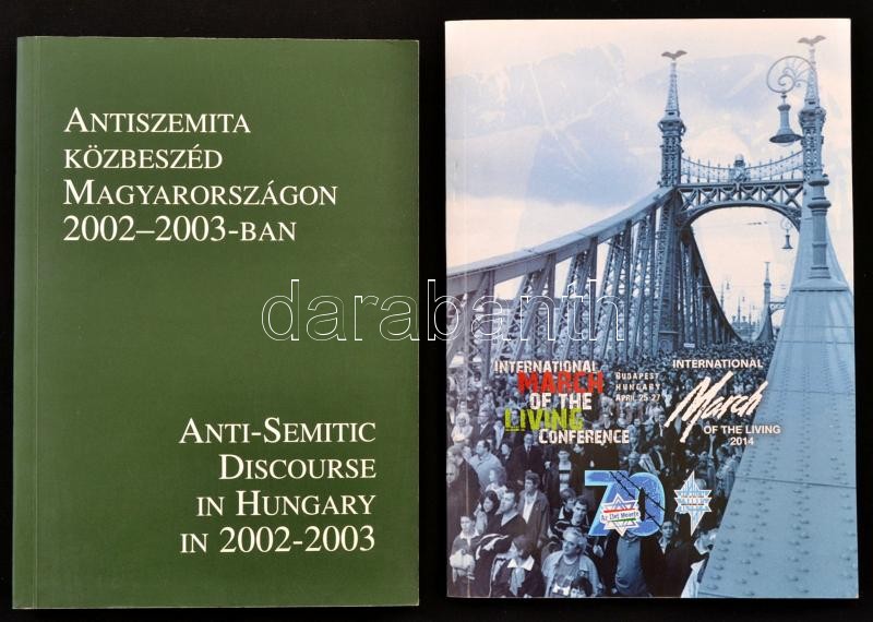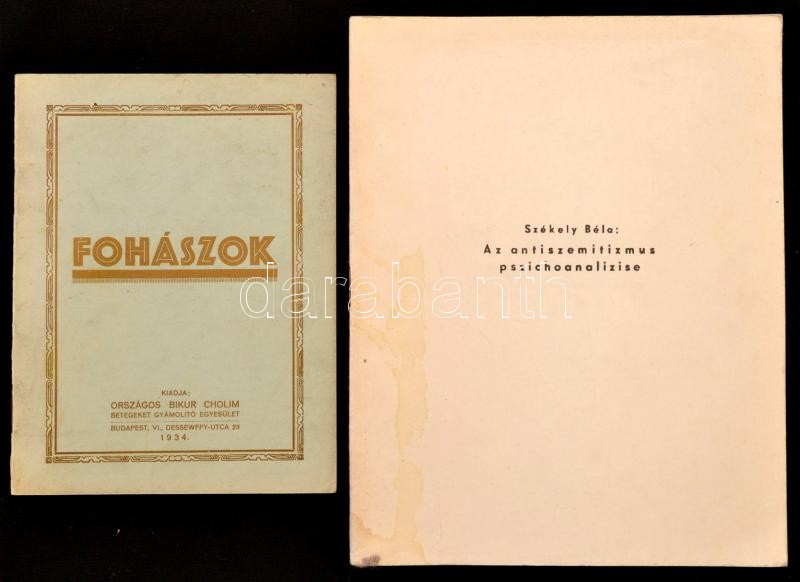 Vegyes könyvtétel, 4 db: Kabbalat Sabbat. Imakönyv péntek estére. Szerkesztette és fordÃtotta Balla Zsolt. Bp., 2010, Balla Zsolt-Balázs Gábor. Kiadói papÃrkötés. Antiszemita közbeszéd Magyarországon 2002-2003-ban. Jelentés és dokumentáció. Szerk.: Dési János, GerÅ‘ András, Szeszlér Tibor, Varga László. Bp., 2004, B'nai B'rith ElsÅ‘ Budapesti Közösség. Kiadói papÃrkötés, magyar és angol nyelven. Székely Béla: Az antiszemitizmus pszichoanalÃzise. hn., 1992, Párbeszéd Könyvek. Kiadói papÃrkötés. Reprint kiadás. Fohászok. Bp., 1934, Országos Bikur Cholim Betegeket GyámolÃtó Egyesület, (Eisler Nyomda-ny.), 16 p. Kiadói papÃrkötés.