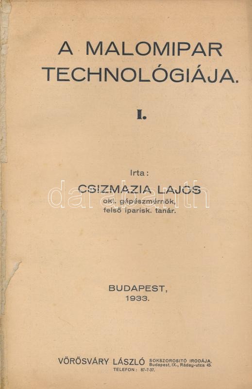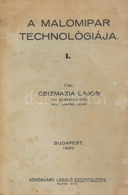 Csizmazia Lajos: A malomipar technológiája I. Bp., 1933, Vörösváry László. Kiadói papírkötésben, foltos borítóval, javított kötéssel, de belül jó állapotban. Első kiadás.