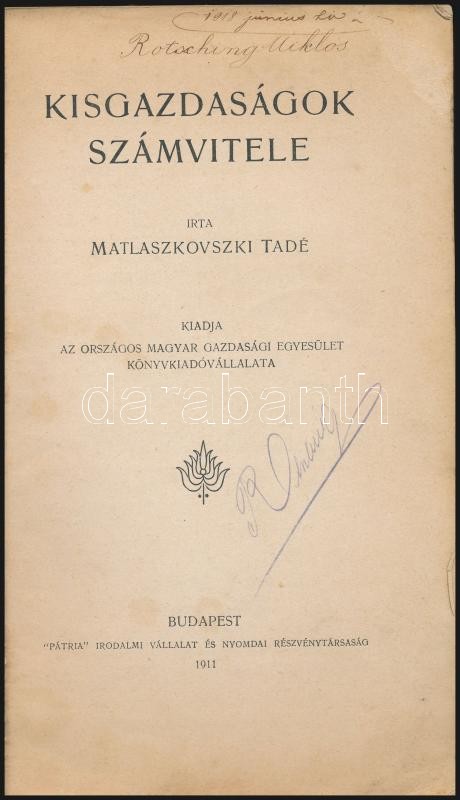 Matlaszkovszki Tádé: Kisgazdaságok számvitele. Köztelek Olcsó Könyvtára III. évf. 11-12. füzet. Bp., 1911, Pátria Irodalmi Vállalat és Nyomdai Rt.-Országos Magyar Gazdasági Egyesület Könyvkiadóvállalata, 96+2 p. Kiadói papírkötésben, foltos borítóval, ceruzás aláhúzásokkal és bejegyzésekkel, névbejegyzéssel.