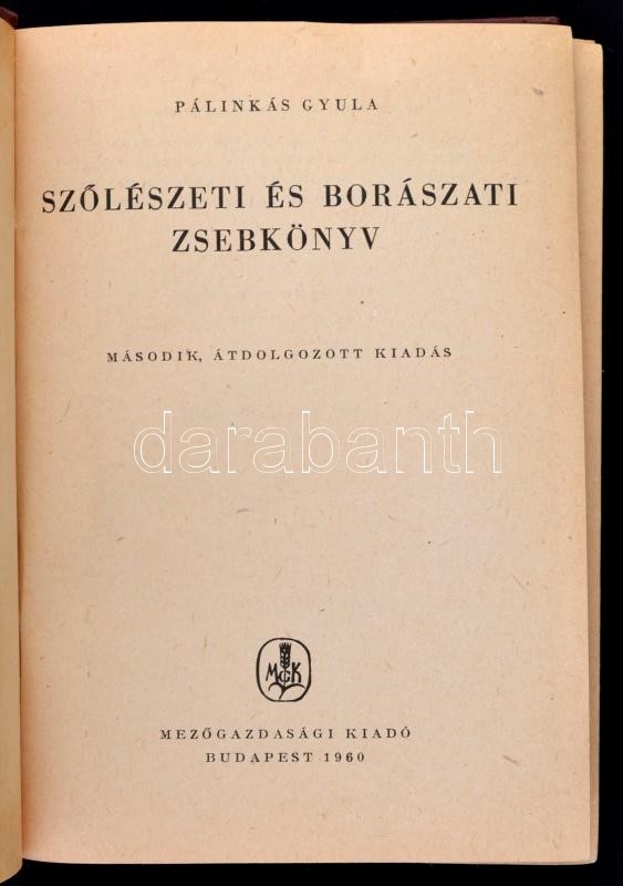 Pálinkás Gyula: Szőlészeti és borászati zsebkönyv. Bp., 1960, Mezőgazdasági. Második, átdolgozott kiadás. Kiadói egészvászon-kötés, kissé kopottas borítóval, kissé foltos gerinccel, de belül jó állapotban.