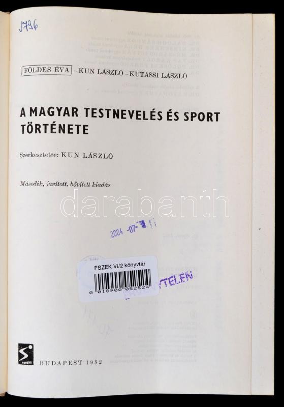 Földes Éva-Kun László-Kutassi László: A magyar testnevelés és sport története. Szerk.: Kun László. Bp.1982, Sport. Második, javított, bővített kiadás. Kiadói egészvászon-kötés, kiadói papír védőborítóban, műanyag védőborítóban, volt könyvtári példány.
