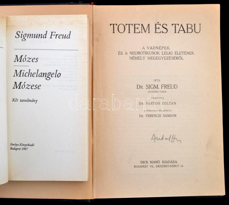 Totem és tabu. A vadnépek és a neurotikusok lelki életének némely megegyezésérÅ‘l. FordÃtotta Dr. Pártos Zoltán. A fordÃtást revideálta: Dr. Ferenczi Sándor. Bp.,(1918), Dick Manó, 174+2 p. Félvászon-kötés. ElsÅ‘ magyar kiadás. Antalffy Mária (1922-1989) grafikus tulajdonosi bejegyzésével.