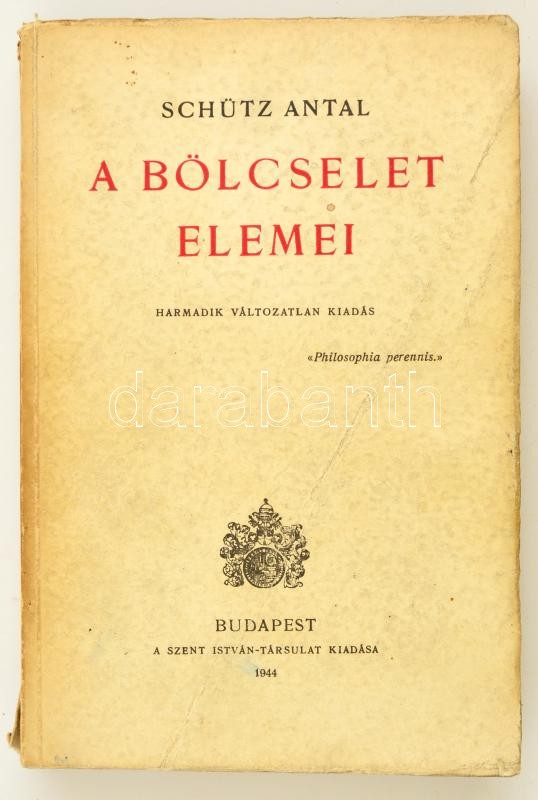 Bp. 1944. Szent-István T... https://www.darabanth.com/hu/308-Gyorsarveres/308.0/Konyvek/Konyvek-Tarsadalomtudomany~500010/Schutz-Antal-A-bolcselet-elemei-3-kiadas--Bp-1944-Szent-Istvan-Tars-Kiadoi-papirborit~II1642656