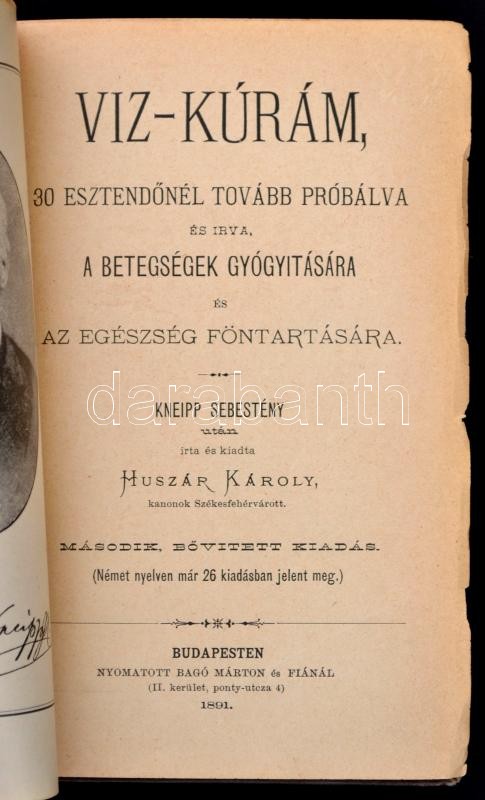 Kneipp Sebestyén: Víz-kúrám, 30 esztendőnél tovább próbálva és írva a betegségek gyógyítására és az egészség föntartására. Kneipp Sebestyén után írta és kiadta Huszár Károly. Bp., 1891, Bagó Márton és Fia. Második, bővített kiadás. Kiadói egészvászon-kötés, kopottas borítóval, egyébként jó álalpotban.