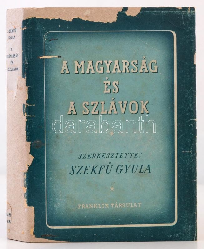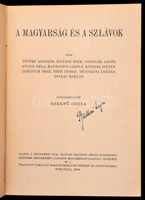 Divéky Adorján, Fügedi Erik, Gogolák Lajos, Gunda Béla, Hadrovics László, Kniezsa István, Lukinich Imre, Thim József, Trócsányi Zoltán, Zsirai Miklós: A magyarság és a szlávok. Szerk.: Szekfű Gyula. Budapest, 1942, Királyi Magyar Pázmány Péter Tudományegyetem Bölcsészeti Karának Magyarságtudományi Intézete-Franklin-Társulat Magyar Irodalmi Intézet és Könyvnyomda, 278+1 p.+4 térkép +2 t. Kiadói papírkötés, kiadói papír védőborítóban, a papír védőborító kissé viseltes, javított, de belül szép állapotban.