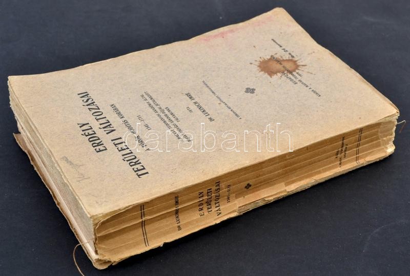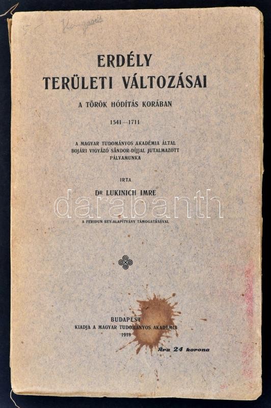 Dr. Lukinich Imre: Erdély területi változásai a török hódítás korában 1541-1711. A MTA által Bojári Vigyázó Sándor-díjjal jutalmazott pályamunka. Bp.,1918, MTA, V+3+646+2 p.+5 kihajtható térképmelléklet. Kiadói papírkötés, sérült kötéssel, 640-641. oldalnál a kötés szétvált.