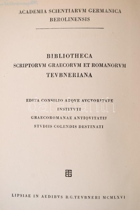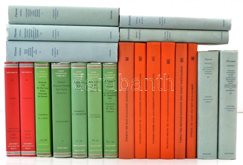 Leírás: Három különböző kritikai kiadás kötetei: Loeb Classical Library (40, 213: Cicero; 57: Hésiodos; 193, 199, 264, 288: Aristotelés); Oxford Classical Texts (Aristotelés: Ethica Nicomachea; Metaphysica; Platón: Opera 1-5. köt.); Bibliotheca Teubneriana (Pausanias: Greaciae descriptio 1-3.; Corpus fabularum Aesopicarum 1.; Ammonius: De adfinium vocabulorum differentia; Xenophon: Institutio Cyri). Összesen 20 kötet, vászonkötésben, jó állapotban.
