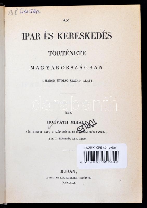 Horváth Mihály: Az ipar és kereskedés története Magyarországban, a három utolsó század alatt. Bp.,1984, ÁKV. Kiadói aranyozott egészvászon-kötés, műanyag védőborítóban, volt könyvtári példány, jó állapotban.