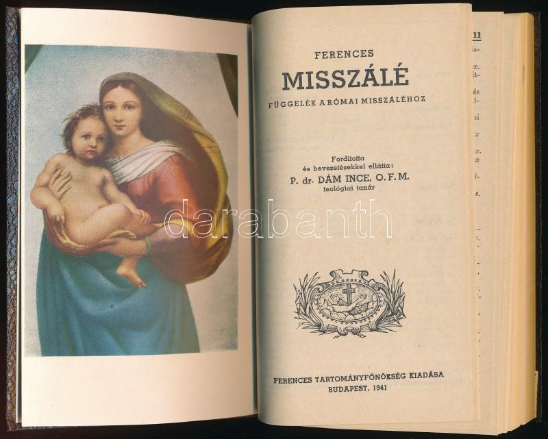 P. Dr. Dám Ince O.F.M.: Ferences misszálé. Függelék a római misszáléhoz. Bp., 1941, Ferences Tartományfőnökség. Korabeli egészvászon-kötésben.