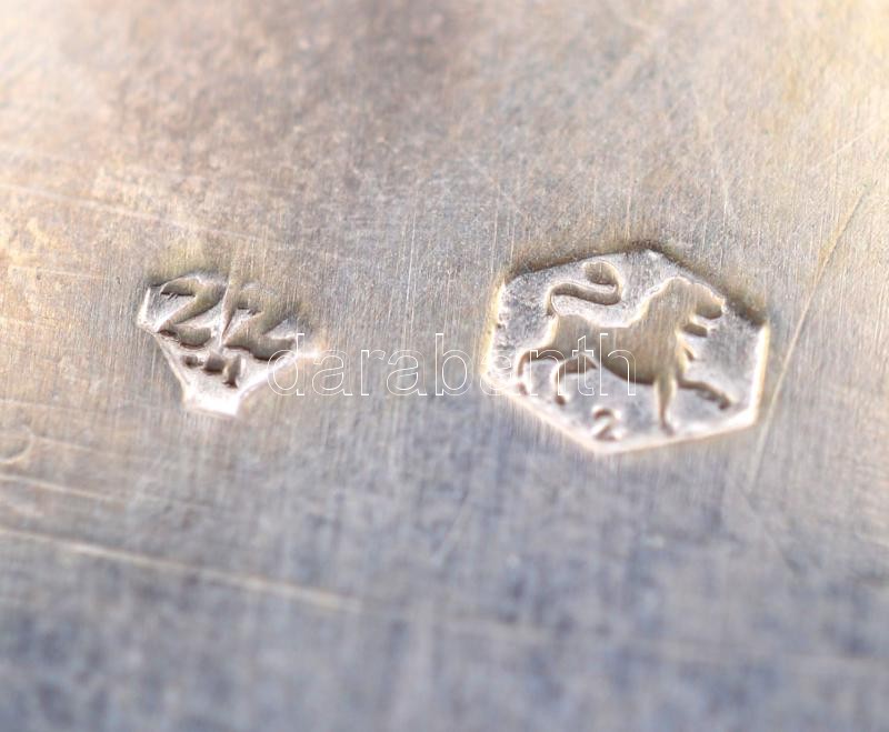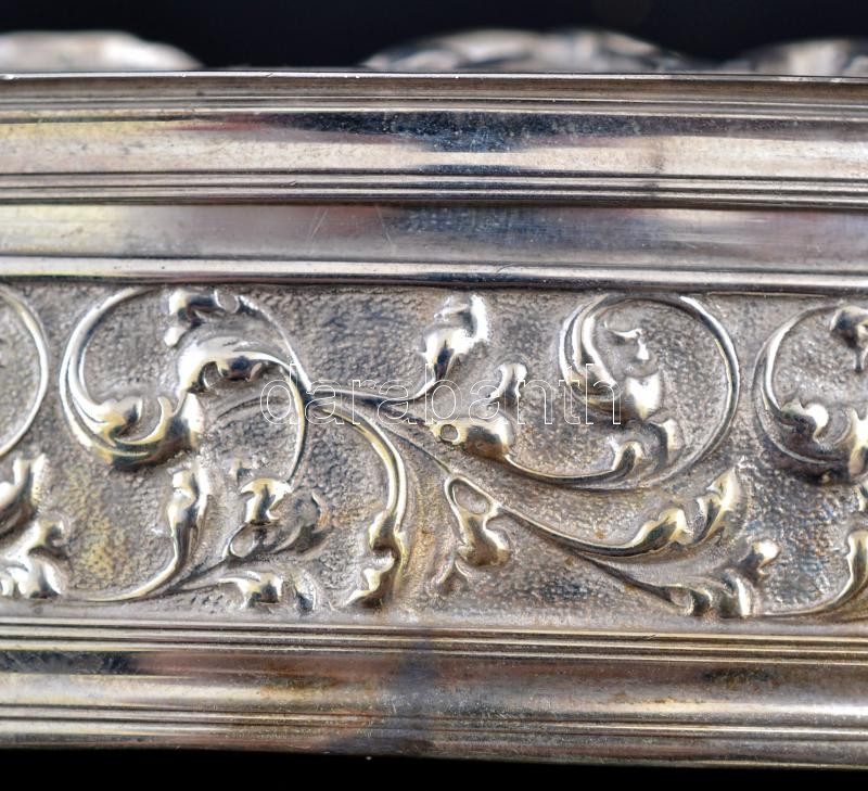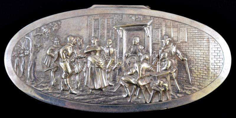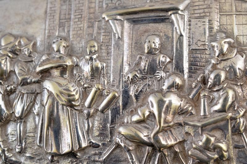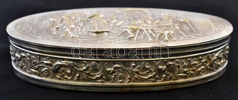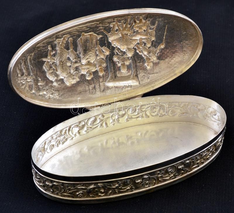 Leírás: Ezüst, fogadói jelenetet ábrázoló ovális bonbonniere. Jelzett, mesterjeggyel / Silver bonbonniere with inn scene. Hallmarked. 178 g 15x7 cm