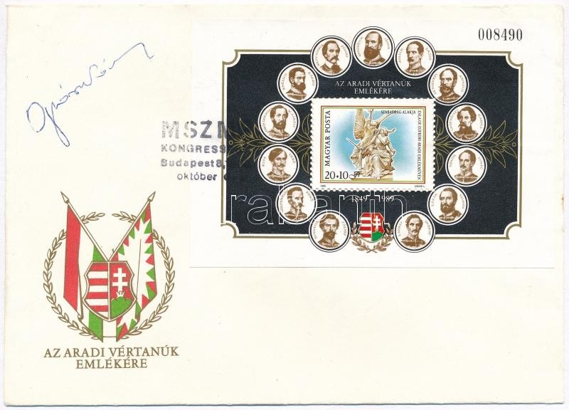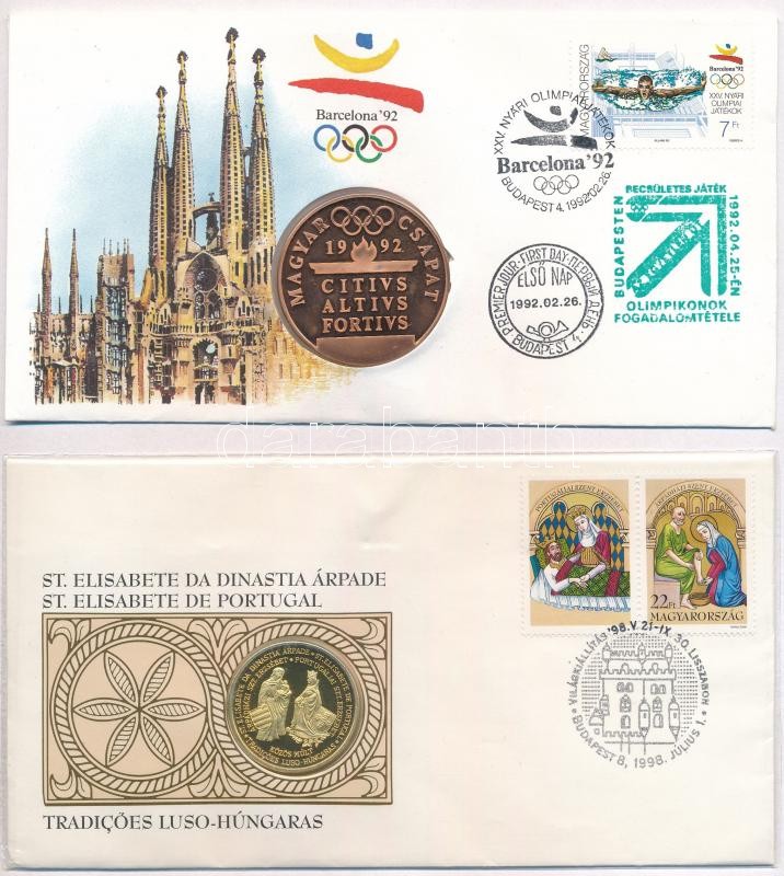 Leírás: 1992. "Barcelona - Magyar csapat" emlékérem bélyeges borítékon, elsőnapi bélyegzéssel + 1998. "Árpád-házi Szent Erzsébet - Portugáliai Szent Erzsébet" aranyozott fém emlékérem felbélyegzett borítékban "1998. július 1. Lisszabon Világkiállítás" bélyegzővel + 1989. Aradi vértanúk FDC Grósz Károly aláírásával T:PP