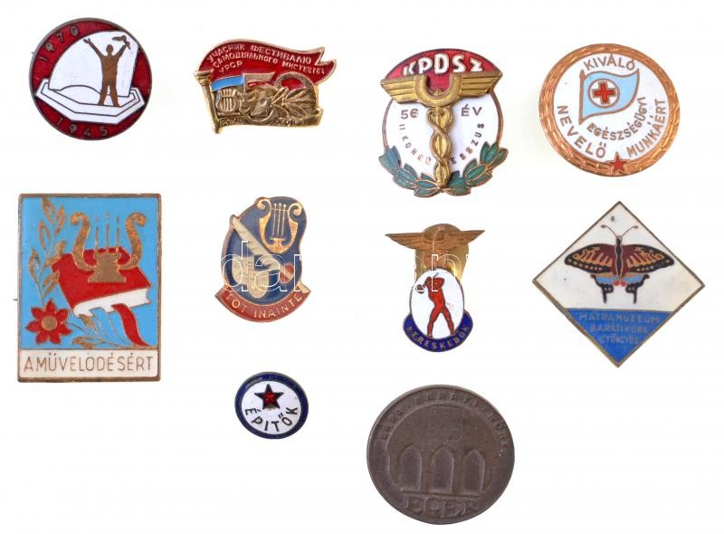 Leírás: 10db-os vegyes, leginkább magyar jelvény tétel, közte "Mátramúzeum Baráti Köre Gyöngyös" zománcozott jelvény, "Eger Vára Baráti Köre" fém jelvény T:2,2-