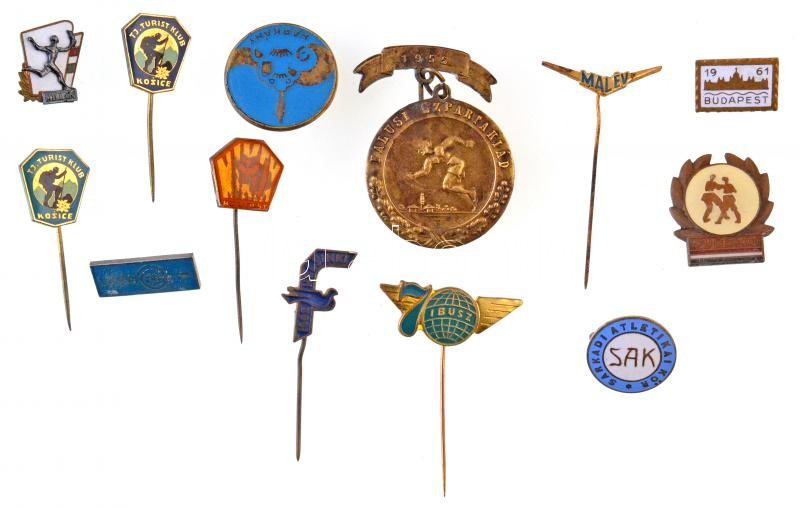 Leírás: 13db-os vegyes, főleg magyar jelvény és kitűző tétel, közte 1955. "Falusi Szpartakiád" fém jelvény, 1961. "Budapest" fém városjelvény, DN "SAK - Sarkadi Atlétikai Kör" T:2,2-