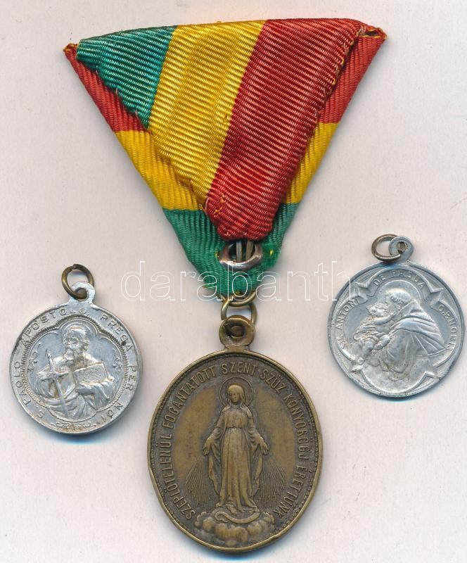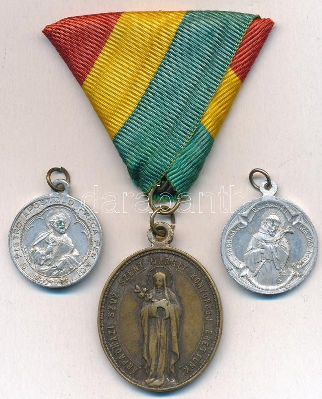 Leírás: 3db-os vallási emlékérem és medál tétel, közte "Árpádházi Szüz Szent Margit könyörögj érettünk" Br emlékérem szalagon T:2,2-