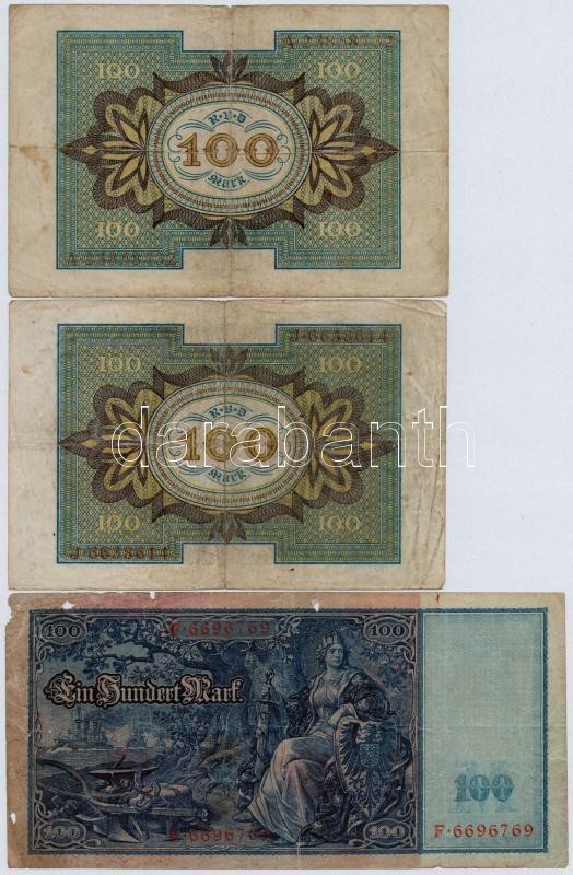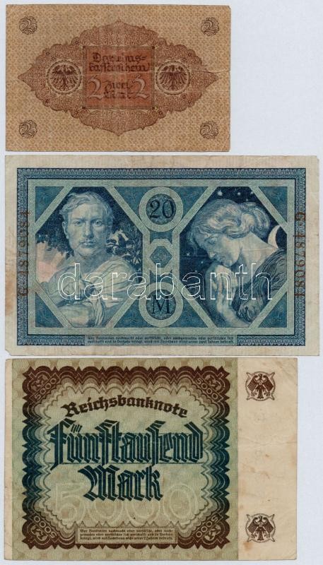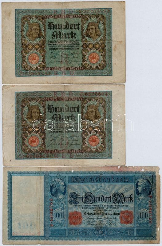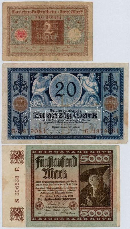 Német Birodalom 1910. 100M piros pecsét + 1915. 20M + Weimari Köztársaság 1920. 2M piros pecsét + 100M (2x) egyik 7, másik 8 jegyű sorszámmal + 5000M T:III-,IV