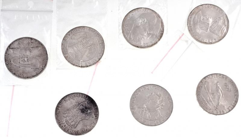 Ausztria 1959-1978. 7db-os forgalmi emlékérme tétel, benne 1959. 50Sch Ag "Tirol felszabadulásának 150. évfordulója" + 1964. 50Sch Ag "IX. Téli Olimpia Innsbruck" + 1965. 50Sch Ag "600 éves a Bécsi Egyetem" + 1969. 50Sch Ag "I. Maximilian halálának 450. évfordulója" + 1970. 50Sch Ag "Karl Renner" + 1972. 50Sch Ag "350 éves a Salzburgi Egyetem" + 1978. 50Sch Ag "Franz Schubert" T:1-,2 Austria 1959-1978. 7pcs of commemorative coins, with: 1959. 50 Schilling Ag "150th Anniversary of the Liberation of Tyrol" + 1964. 50 Schilling Ag "Winter Olympics Insbruck" + 1965. 50 Schilling Ag "600th Anniversary - Vienna University" + 1969. 50 Schilling Ag "450th Anniversary of the Death of Maximilian I" + 1970. 50 Schilling Ag "Karl Renner" + 1972. 50 Schilling Ag "350th Anniversary - Salzburg University" + 1978. 50 Schilling Ag "Franz Schubert" C:AU,XF Krause KM#2888, KM#2896, KM#2898, KM#2906, KM#2909, KM#2913, KM#2922