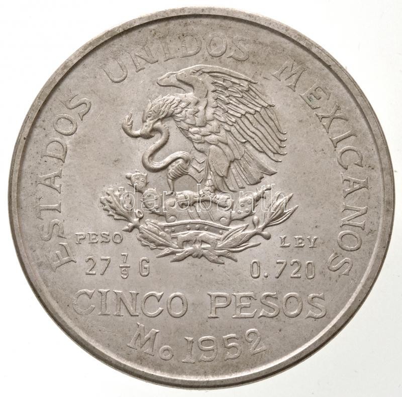 Krause KM#467 https://www.darabanth.com/hu/308-Gyorsarveres/308.0/Numizmatika/Kulfoldi-fem-es-ezustpenzek~300013/Mexiko-1952-5P-Ag-T1---Mexico-1952-5-Pesos-Ag-CAU--Krause-KM23467~II1669148