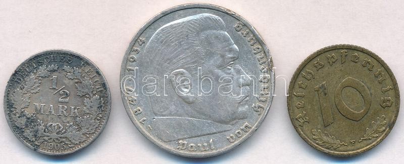 Német Birodalom 1905A 1/2M Ag + Német Harmadik Birodalom 1935A 5M Ag "Hindenburg" + 1938F 10pf Al-Br T:2,2-,3 ph.