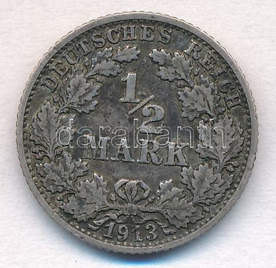 German Empire 1913F 1/2 Mark... https://www.darabanth.com/hu/308-Gyorsarveres/308.0/Numizmatika/Kulfoldi-fem-es-ezustpenzek~300013/Nemet-Birodalom-1913F-12M-Ag-T2-patina--German-Empire-1913F-12-Mark-Ag-CXF-patina~II1674136